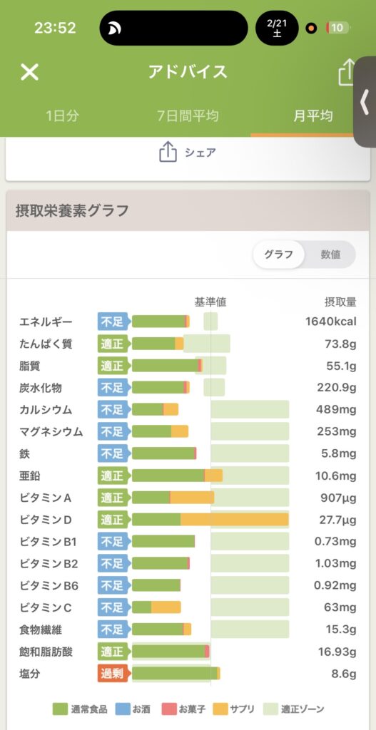 「これ絶対、栄養足りてないよな…」と思って、あすけんで2ヶ月間ちゃんとデータを取ってみたんです。